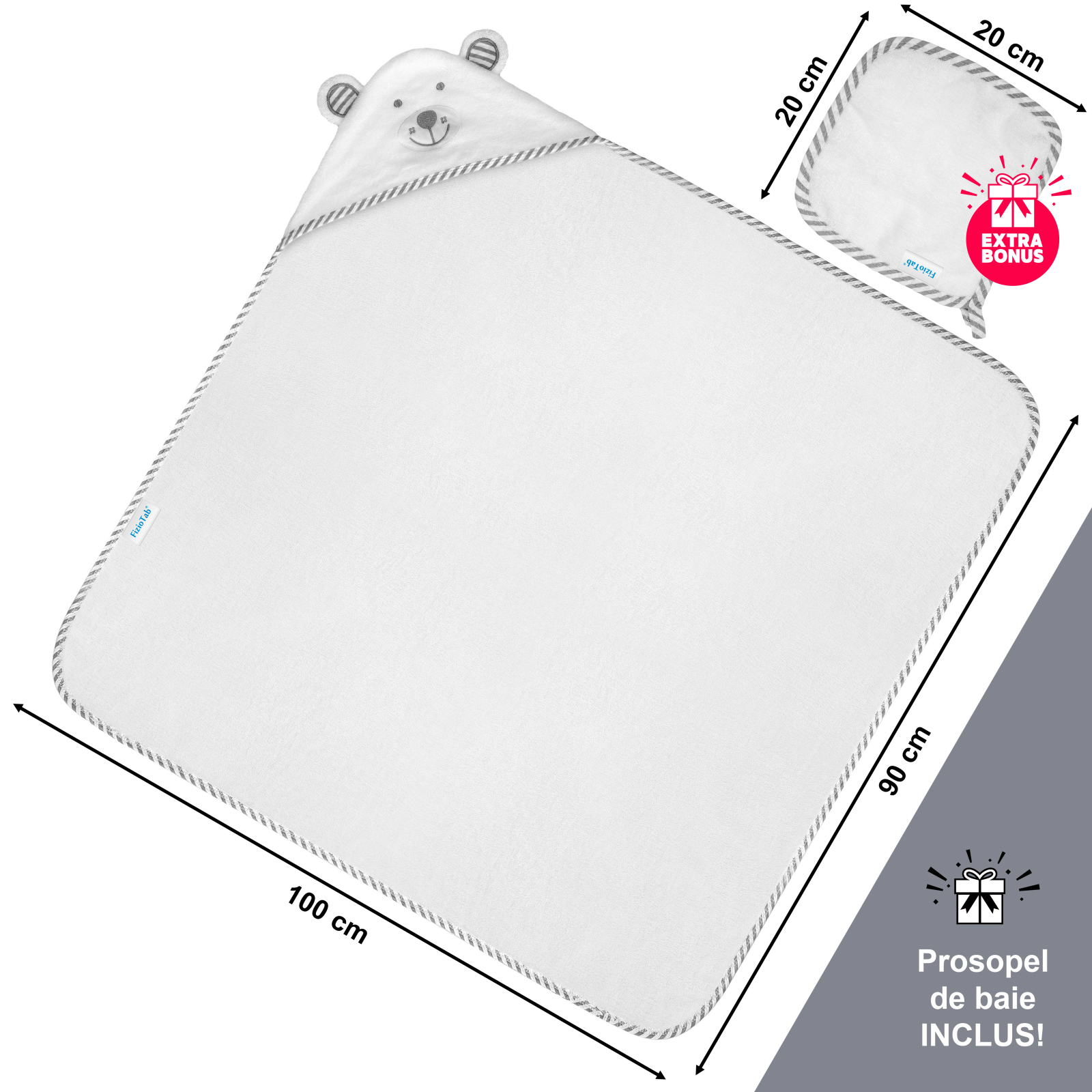 - Prosopul cu glugă este acum disponibil în dimensiune mărită, 90x100 cm, pentru a vă bucura de confortul și utilitatea lui pentru mai mult timp!