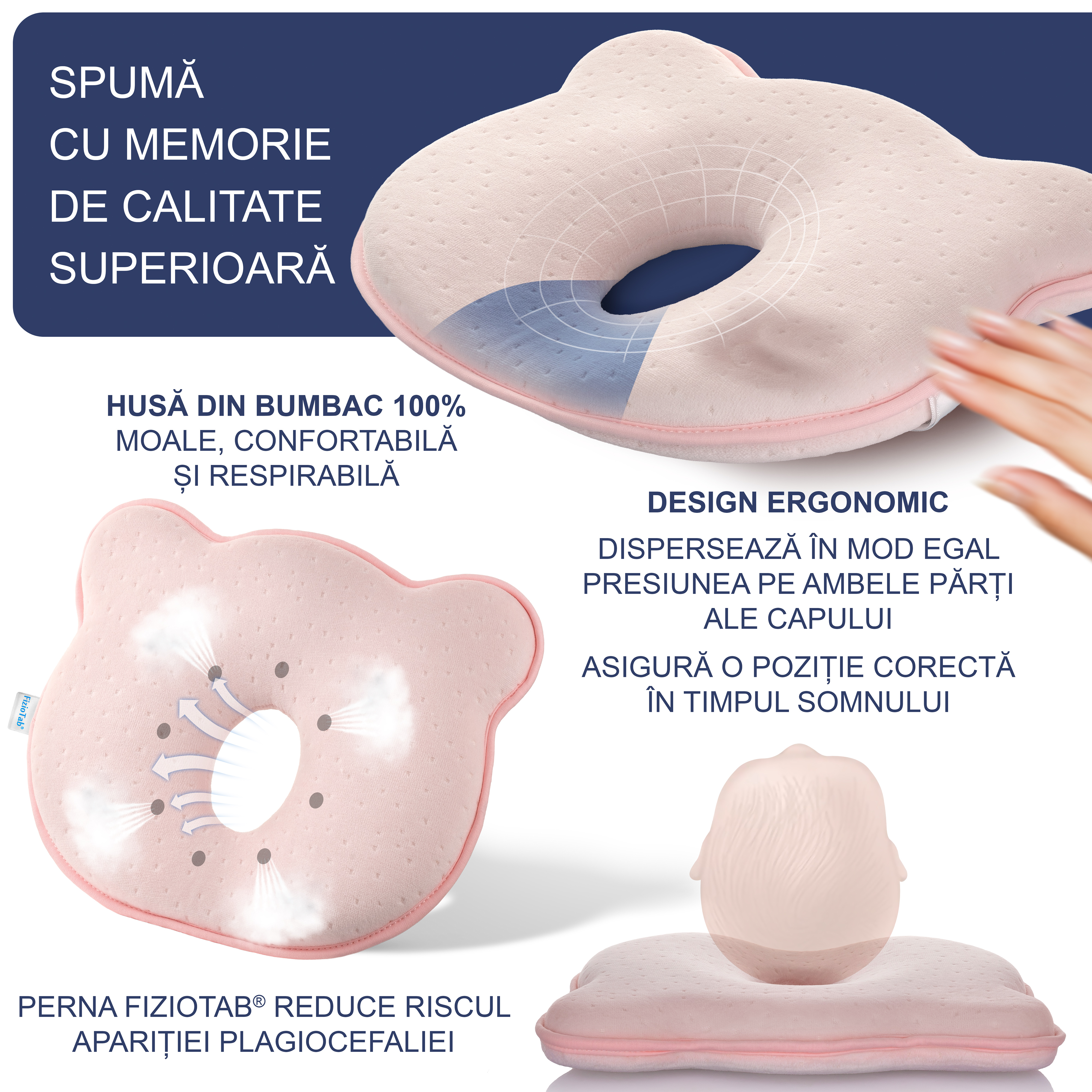 - Culoare ROZ, noua in gama pernutelor FizioTab®, placuta si delicata, creata special pentru confortul bebelusului tau, zi si noapte, contribuind la confortul si imbunatatirea calitatii somnului lui!