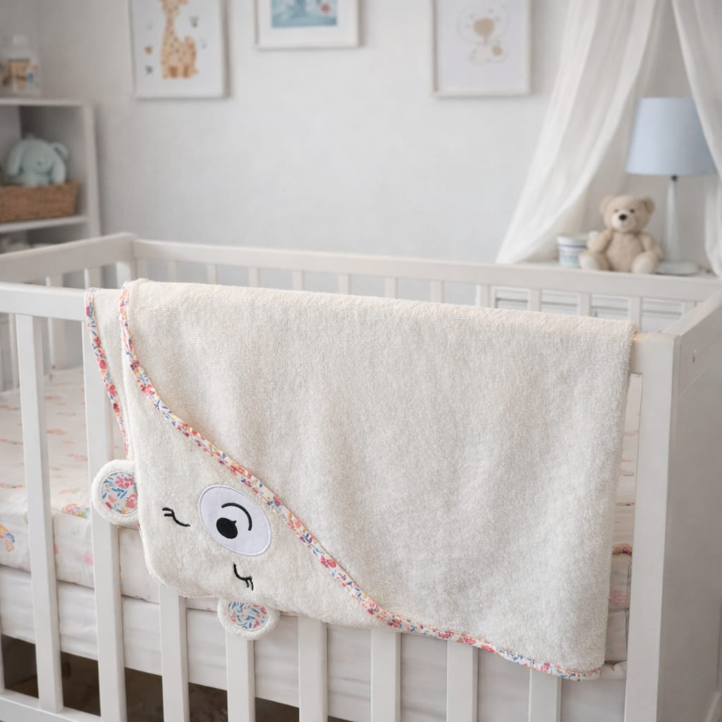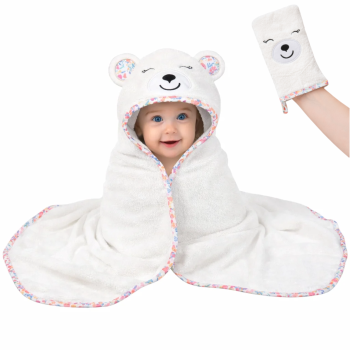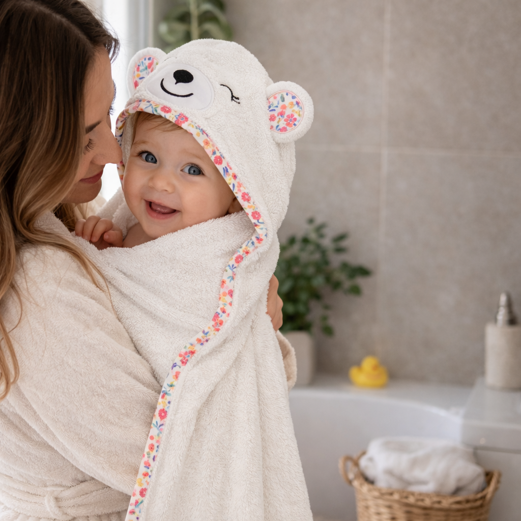 Prosop de baie cu gluga – MODEL NOU FizioTab®, cu urechiuse decorative si margini florale roz!