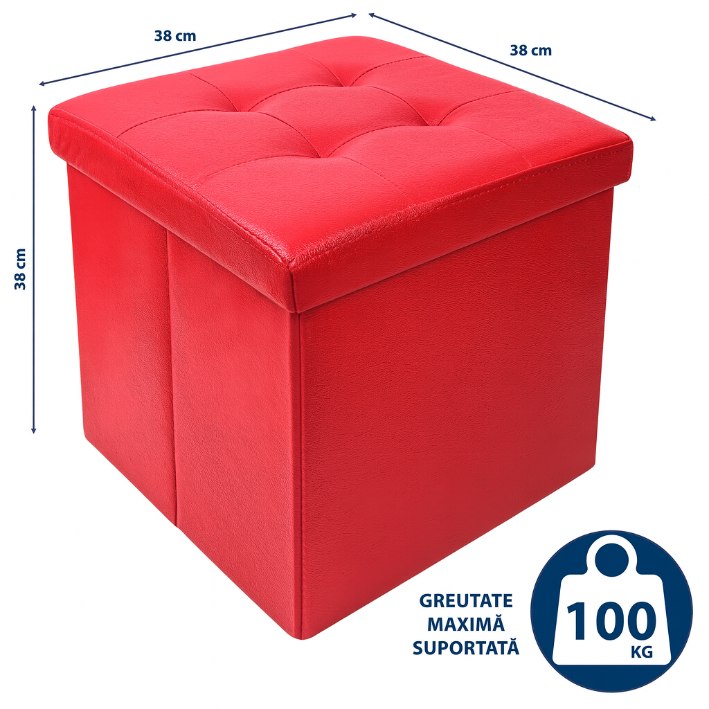 Taburet Pliabil cu Spatiu de Depozitare FizioTab®, Tip Cutie, Otoman, Piele ecologica, Cub 38X38X38 cm, Rosu